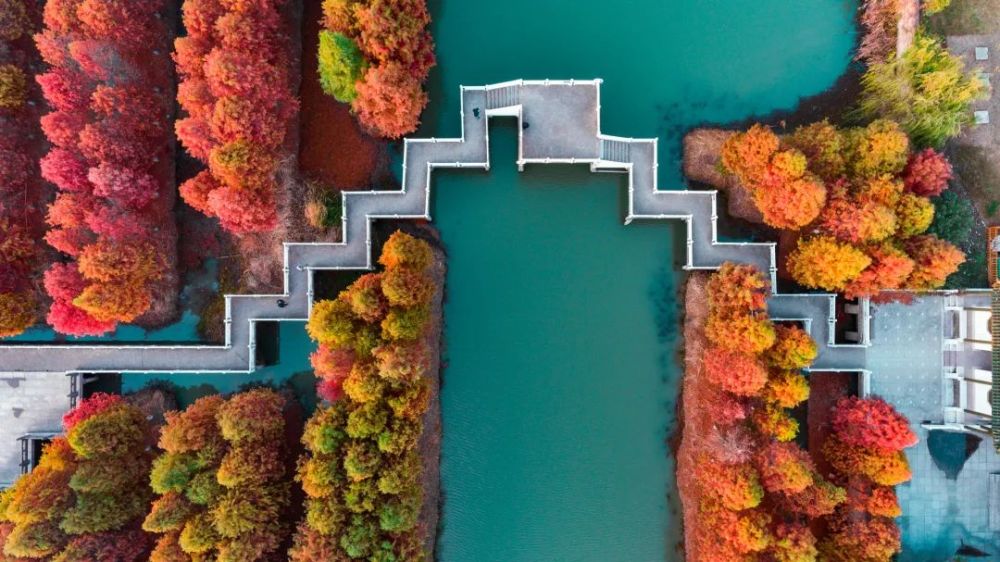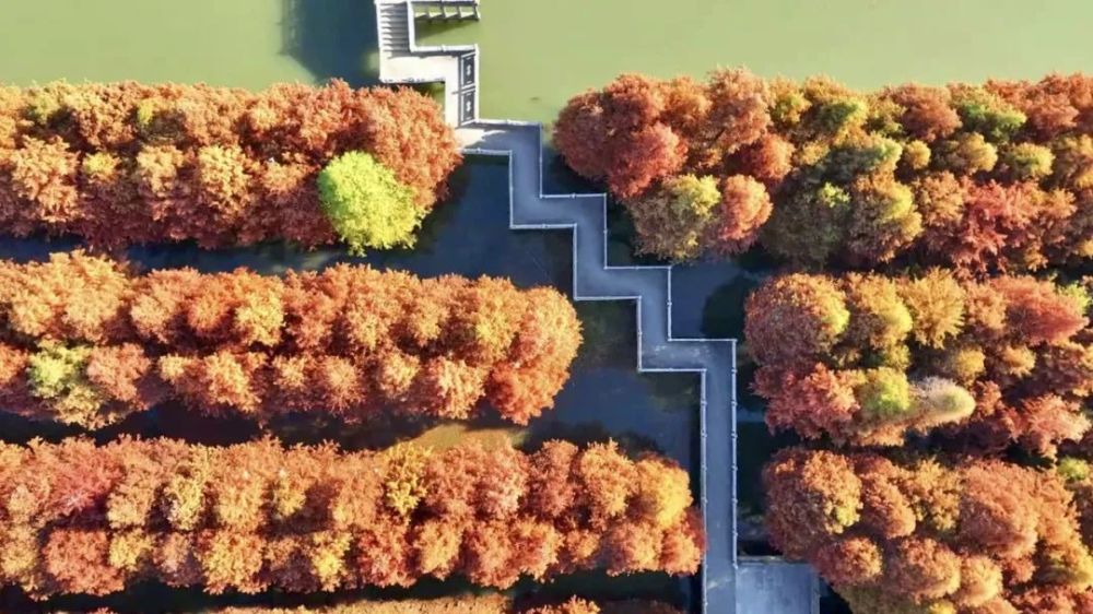 從空中俯瞰,色彩斑斕的水杉樹仿若威武衛士,屹立于河坡、小島之上,與綠地灌木相接,與碧波河面相連,層次分明 相映成趣。(鹽軒)