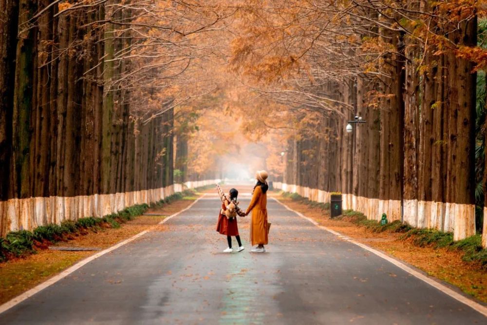 漫步林間棧道,每一步都是風景的盛宴。伸手可及的紅水杉樹葉,如同初冬里的一抹溫暖,點亮了這片林間世界。