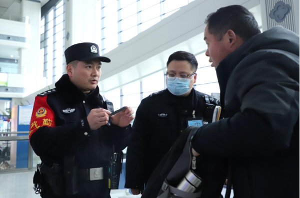 民警在向旅客解釋鐵路禁止和限制攜帶危險品種類。劉濤 攝