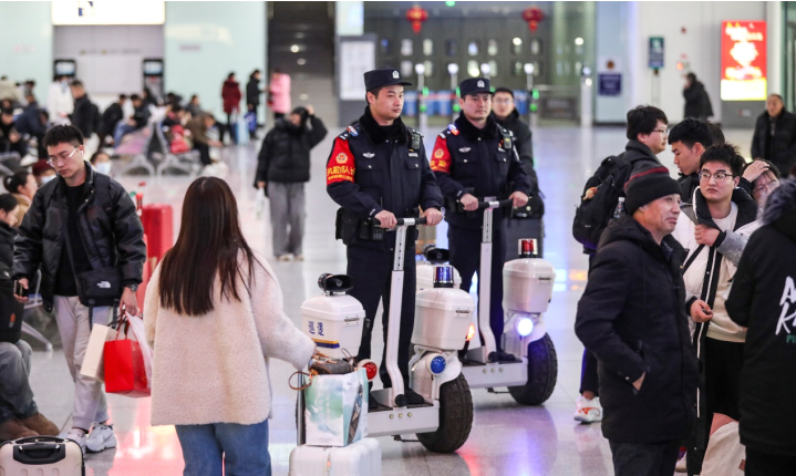 “請大家有序排隊、不要擁擠,時間來得及,都能趕上車?!薄皫∨笥训穆每?,請照看好自己的孩子,謹防走失?!薄俺塑嚂r請看好自己的行李物品,不要遺忘?!痹诨窗矕|站進站口,民警朱治宇通過喇叭向出行旅客進行安全提醒。針對假期探親旅游返程、進城務工客流疊加等情況,淮安東站派出所提前部署,暫停民警春節休假,全員在崗在位、增加一線警力投入,按照“警力跟著客流走、警情走”的原則,科學合理布警,堅持顯性用警,提升鐵路站區治安秩序維護和巡邏防控水平。同時積極與車站客運部門對接,在進站口、安檢處、檢票口設置引導牌、隔離帶、警戒線,協調淮安市青年志愿者協會投入28名志愿者,在淮安東站設置志愿者服務崗,協助應對返程客流高峰,引導旅客安全有序乘車。