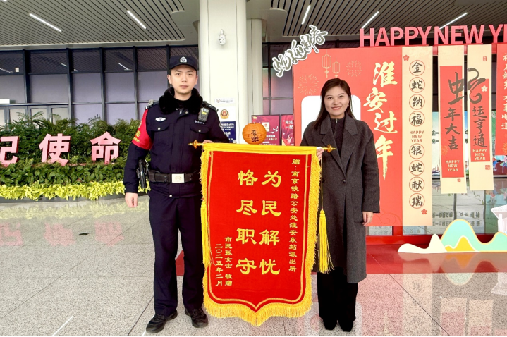 出行旅客向民警送來錦旗表示感謝。趙啟瑞 攝