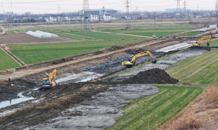 在和平鎮三閘村西側的二河東堤旁,數臺挖掘機正在同步施工,將周邊零散池塘逐個打通,使其最終成為一個寬約22米、長約200米的大魚塘。