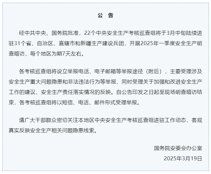 新華社北京3月19日電   記者19日從應急管理部獲悉,2025年度中央安全生產考核巡查一季度安全生產明查暗訪日前正式啟動。由國務院安委會有關成員單位負責同志帶隊的22個中央安全生產考核巡查組陸續進駐31個省份和新疆生產建設兵團。