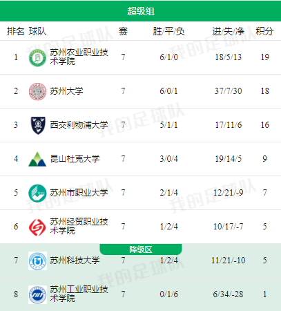 超級組最后一場,農職院坐鎮主場,迎戰西交利物浦。在上半場四分鐘就落后一球的情況下,憑借6號尕瑪巴桑68分鐘門前機警地補射破門,農職院成功扳平比分,1比1與西交利物浦握手言和。最終農職院6勝1平積19分,力壓蘇大,奪得第二屆大學生足球聯賽超級組的冠軍!蘇州大學、西交利物浦分列二三名。