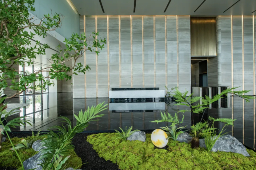 用綠植、山石等中西方設計元素