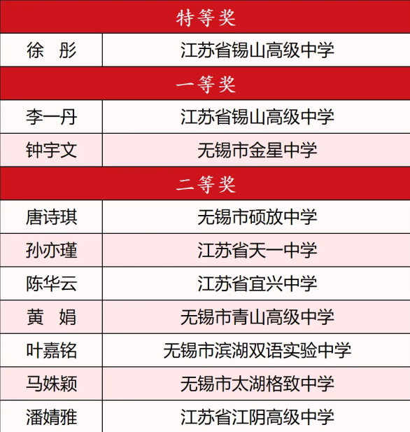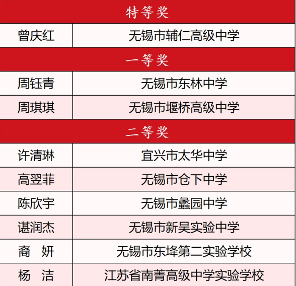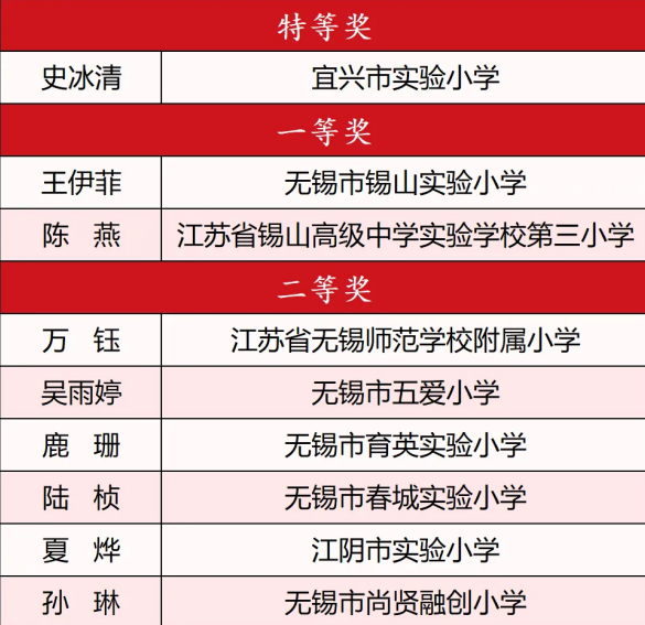 經過評委打分宜興市實驗小學史冰清無錫市江南中學教育集團龔璐無錫市新城中學楊燕華江蘇省錫山高級中學徐彤無錫市輔仁高級中學曾慶紅5位教師憑借出色表現榮獲各組別特等獎。