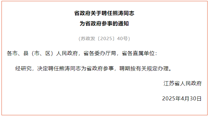 近日,江蘇省政府發布了關于聘任熊濤同志為省政府參事的通知。具體如下: