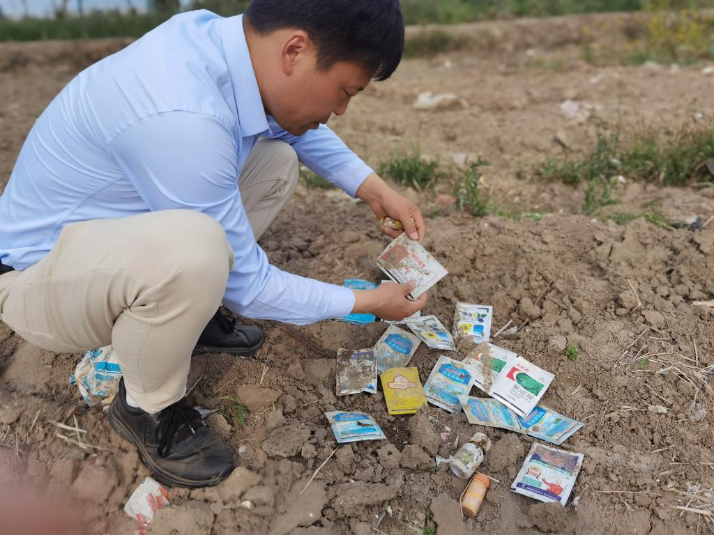 “從包裝袋可以看出,這里使用過防病蟲害的農藥、增綠增亮的葉面肥等,大量使用,土地必然板結、鹽堿化,進而被種植戶放棄?!毙煜蚯罢f,這片地塊需要人工清理碎石以及各種塑料袋之后,再通過旋耕有機肥進行改良。