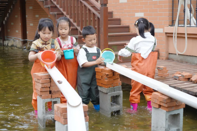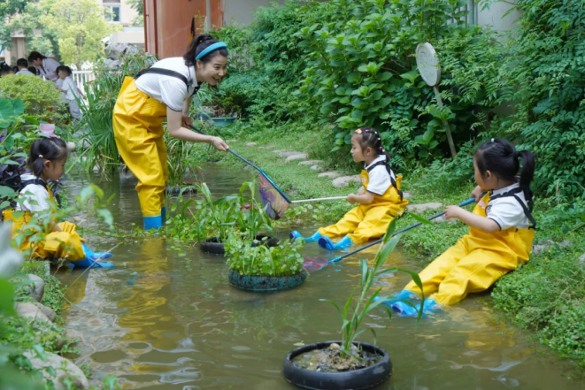 橫扇幼兒園秉承讓兒童“玩得嗨”的辦園理念,尊重兒童的主體地位,倡導幼兒成為幼兒園的小主人,與教師共同創設游戲活動場域。根據兒童的興趣和需要,師生共同建設游戲環境,使其在和花草樹木、沙石田土親密接觸中感受自然,體驗生命。在共創游戲場域中,達成多方可持續性的發展,讓幼兒園的一草一木、小動物、幼兒和教師和諧共融,共同成長。同時,聯結家庭與社區,突破游戲時空限制,保障兒童游戲權利。
