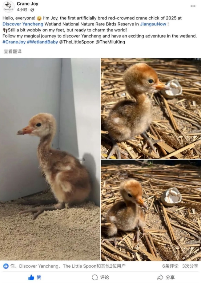 “太可愛了!”“像只小鴨子”呆萌甜酷的模樣瞬間萌化了全球網友的心,引發眾多關注和評論。這只鶴寶寶出生于4月13日,是江蘇鹽城濕地珍禽國家級自然保護區2025年首只人工繁育的丹頂鶴,它的破殼標志著今年丹頂鶴人工育雛工作的正式開始,也意味著“Crane Joy”(丹頂鶴)賬號成為展示燕舞風采和鹽城魅力的重要平臺。