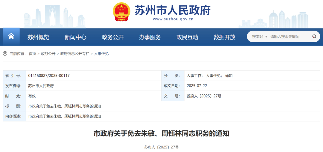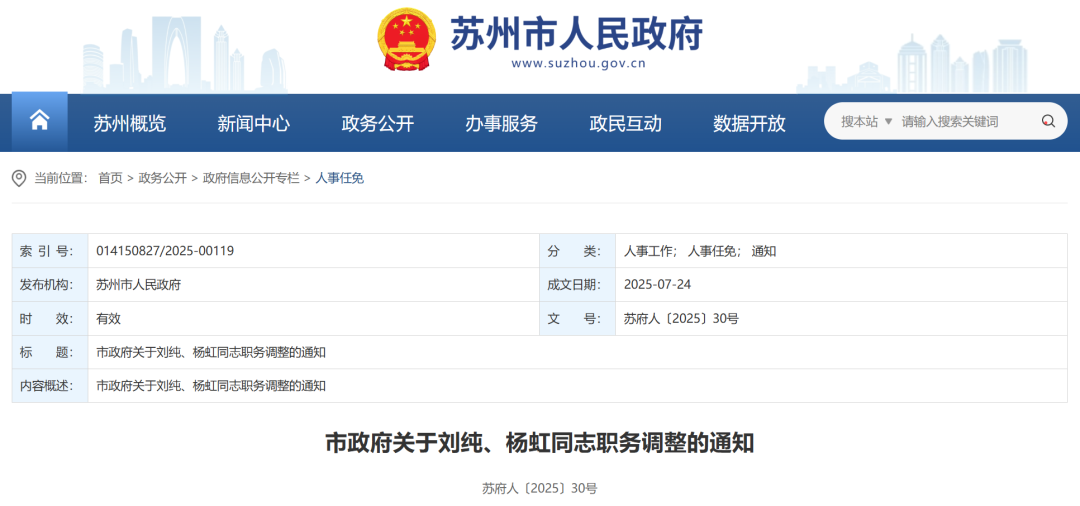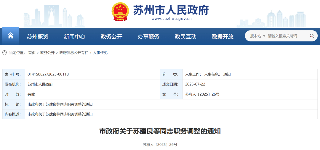日前,蘇州市人民政府網站公布一批人事調整。