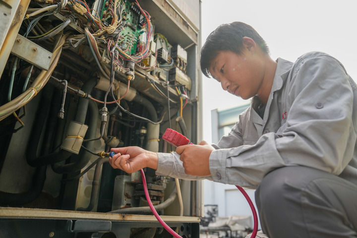 6月24日,許俊杰在江蘇大學一處教學樓樓頂對中央空調外機進行維護。新華社記者李博攝