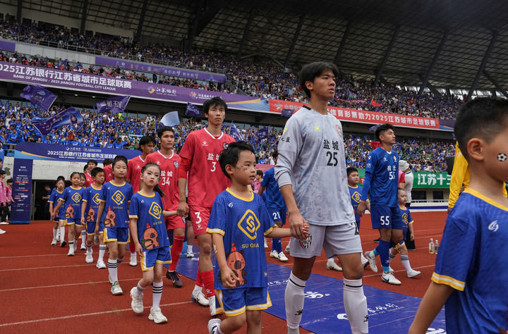 6月21日,嚴子航(前右一)在“蘇超”第四輪鹽城隊對陣宿遷隊的比賽前入場。新華社發(周晨陽攝)