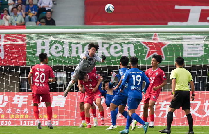 6月21日,嚴子航(左二)在“蘇超”第四輪鹽城隊對陣宿遷隊的比賽中撲救。新華社發(周晨陽攝)