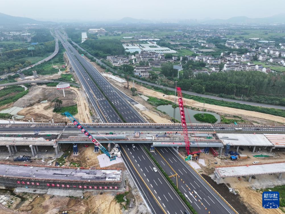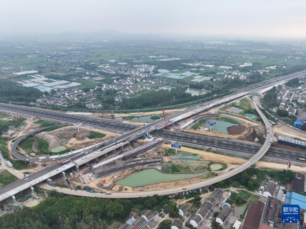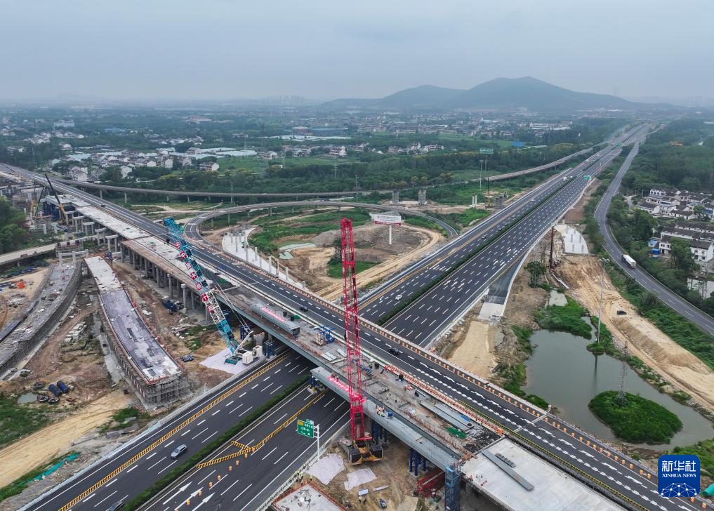 9月13日拍攝的滬武高速公路擴建工程江陰段上跨京滬高速公路鋼箱梁架設施工現場(無人機照片)。
