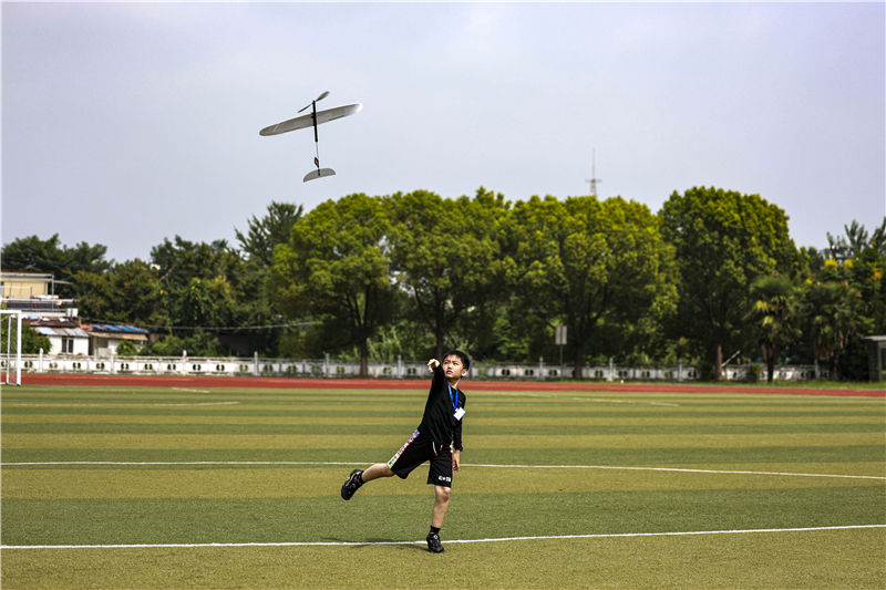 選手在參加“星空號”一級橡筋動力飛機項目比賽