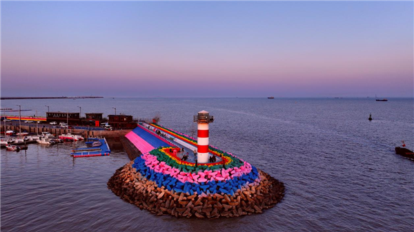 日落時分,港區西連島堤頭燈塔與彩繪防波堤交相輝映,海面被余暉染成金色,歸港漁船緩緩搖曳。游客在燈塔、彩繪堤壩和主題墻繪前駐足拍照,這里逐步成為游客熱衷的“藍色打卡地”。