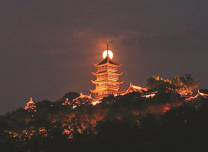 10月6日晚,一輪滿月與南通狼山國家森林公園支云塔交相輝映。 許叢軍 攝