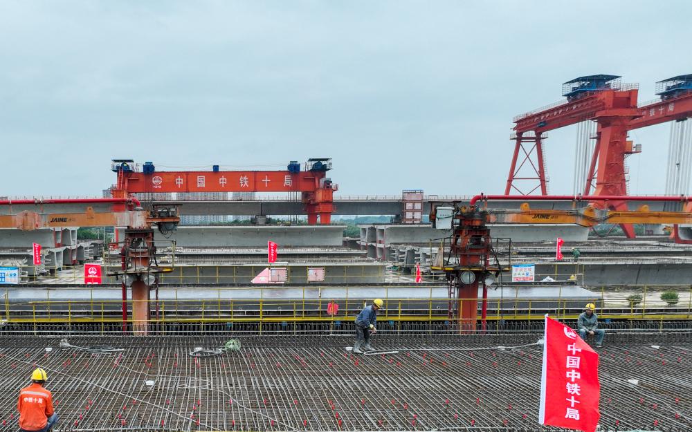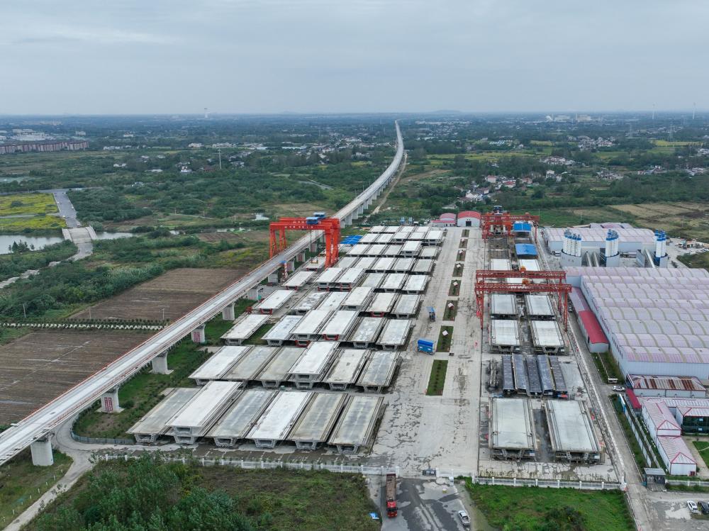 近日,在滬渝蓉高鐵揚州段,由中鐵十局參建的揚州制梁場完成轄區內870榀箱梁預制任務,為下一階段的架梁施工、橋面建設奠定基礎。滬渝蓉高鐵是國家“八縱八橫”高速鐵路網沿江通道的重要組成部分,對于推動長江經濟帶發展、優化區域綜合交通結構具有重要意義。新華社記者李博 攝