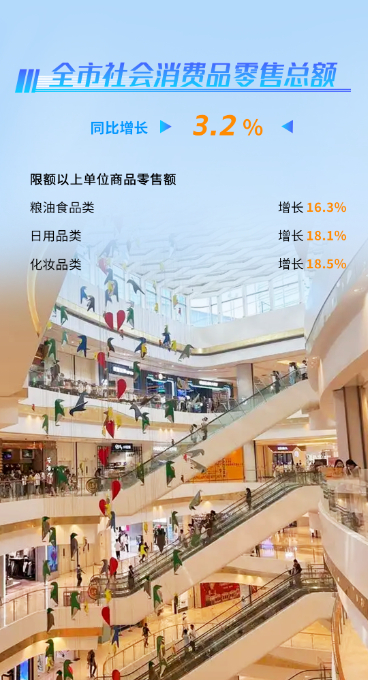 前三季度,全市實現社會消費品零售總額6812.4億元,同比增長3.2%。民生類商品增長較快。限額以上單位糧油食品類、服裝鞋帽針紡織品類、日用品類商品零售額分別增長16.3%、9.0%和18.1%。綠色化、智能化、品質化消費增勢較好。全市限額以上單位能效等級為1級和2級的綠色家電、可穿戴智能設備類、化妝品類零售額分別增長35.8%、177.6%和18.5%。全市限額以上批發和零售業通過公共網絡實現零售額增長8.6%,占社會消費品零售總額的比重達15.5%。