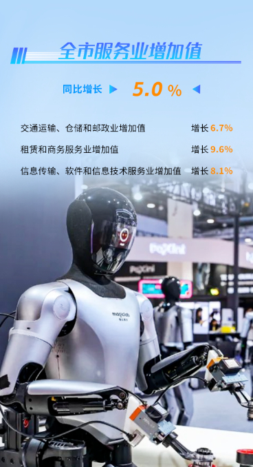前三季度,全市服務業增加值同比增長5.0%。其中交通運輸、倉儲和郵政業增加值增長6.7%,租賃和商務服務業增加值增長9.6%,信息傳輸、軟件和信息技術服務業增加值增長8.1%。1~8月全市規模以上服務業實現營業收入同比增長8.5%。其中商務服務業、互聯網和相關服務、軟件和信息技術服務業營業收入分別增長12.7%、10.3%和12.9%。生產生活性服務業穩定發展。生產性服務業營業收入增長8.2%。生活性服務業營業收入增長8.5%,其中居民出行、旅游游覽和娛樂服務、養老服務等營業收入均實現兩位數增長,分別增長23.6%、13.9%和12.5%。前三季度全市鐵路、公路、水路貨運周轉量同比分別增長30.0%、9.2%和36.9%。全社會快遞業務量30.5億件,同比增長21.7%,快遞業務收入239.1億元,增長10.5%。
