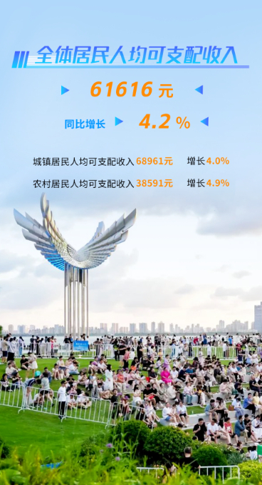 前三季度,全市全體居民人均可支配收入61616元,同比增長4.2%,其中城鎮居民人均可支配收入68961元,增長4.0%;農村居民人均可支配收入38591元,增長4.9%。全市城鄉公共服務支出占一般公共預算支出的比重達80.4%。前三季度城鎮新增就業31.47萬人。從2025年7月1日起最低生活保障標準由1155元/月提高到1208元/月。