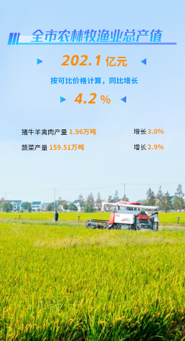 前三季度,全市實現農林牧漁業總產值202.1億元,按可比價格計算同比增長4.2%,其中農業產值增長6.0%,牧業產值增長10.7%。秋糧長勢基本穩定。前三季度豬牛羊禽肉產量1.96萬噸,同比增長3.0%,其中豬肉產量1.85萬噸,增長2.7%。蔬菜產量159.51萬噸,增長2.9%。水產品產量9.04萬噸,增長0.3%。9月末全市生豬存欄20.50萬頭,同比增長13.7%。前三季度生豬出欄23.36萬頭,同比增長5.7%。
