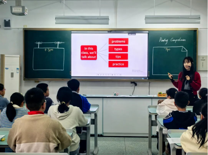 針對細節理解題,她強調“尋讀定位+同義替換”的核心方法,指導學生圈畫人名、地名、數字等關鍵詞快速鎖定答案;面對推理判斷題,通過實例解析“排除法”的應用,提醒學生警惕絕對化表述和無依據聯想;在主旨大意題教學中,傳授“略讀首尾段+抓高頻詞”的技巧,幫助學生精準把握文章核心;對于詞義猜測題,則總結了因果關系、同義詞、構詞法等五種猜詞策略。整堂課以真題為載體,講練結合,讓學生在實戰中掌握解題方法,也為聽課教師提供了可借鑒的課堂教學范式。