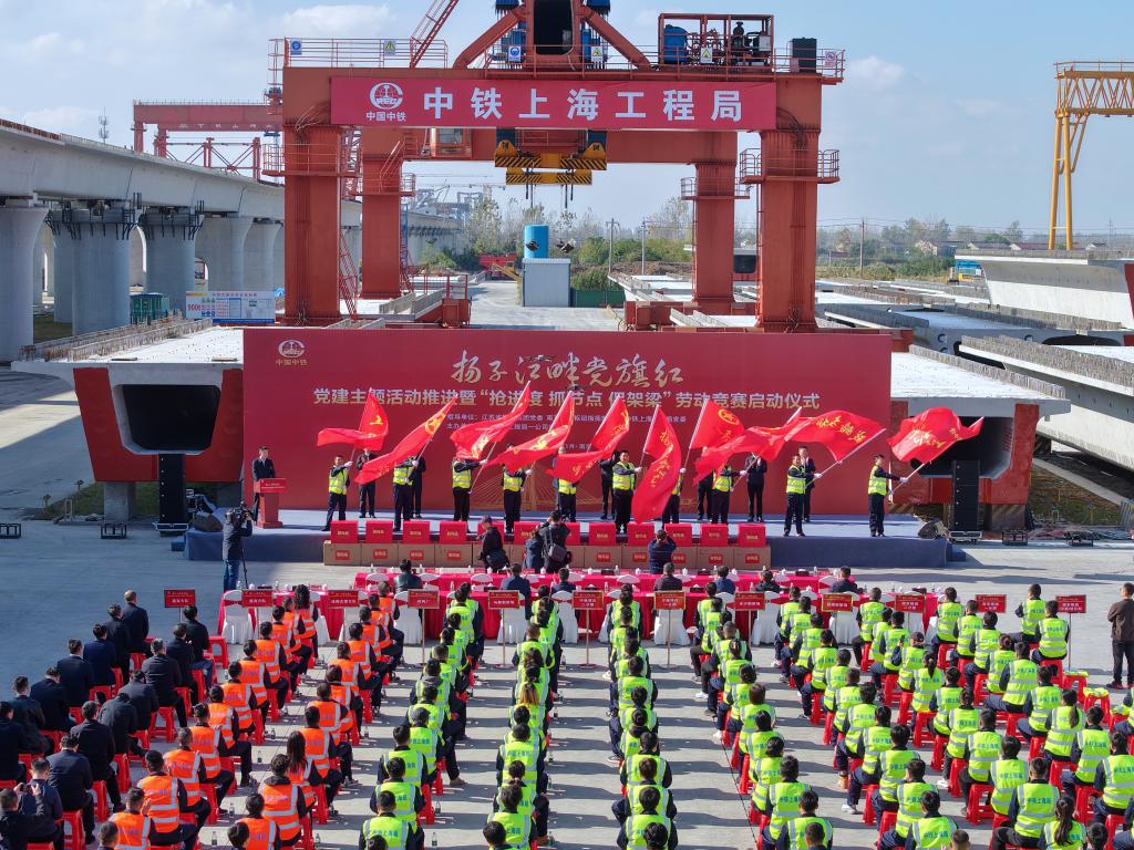 11月11日,中鐵上海工程局在寧淮城際鐵路馬鞍制梁場舉行“搶進度、抓節點、保架梁”勞動競賽活動,全力推進滬渝蓉高鐵南京樞紐、寧淮城際鐵路建設。